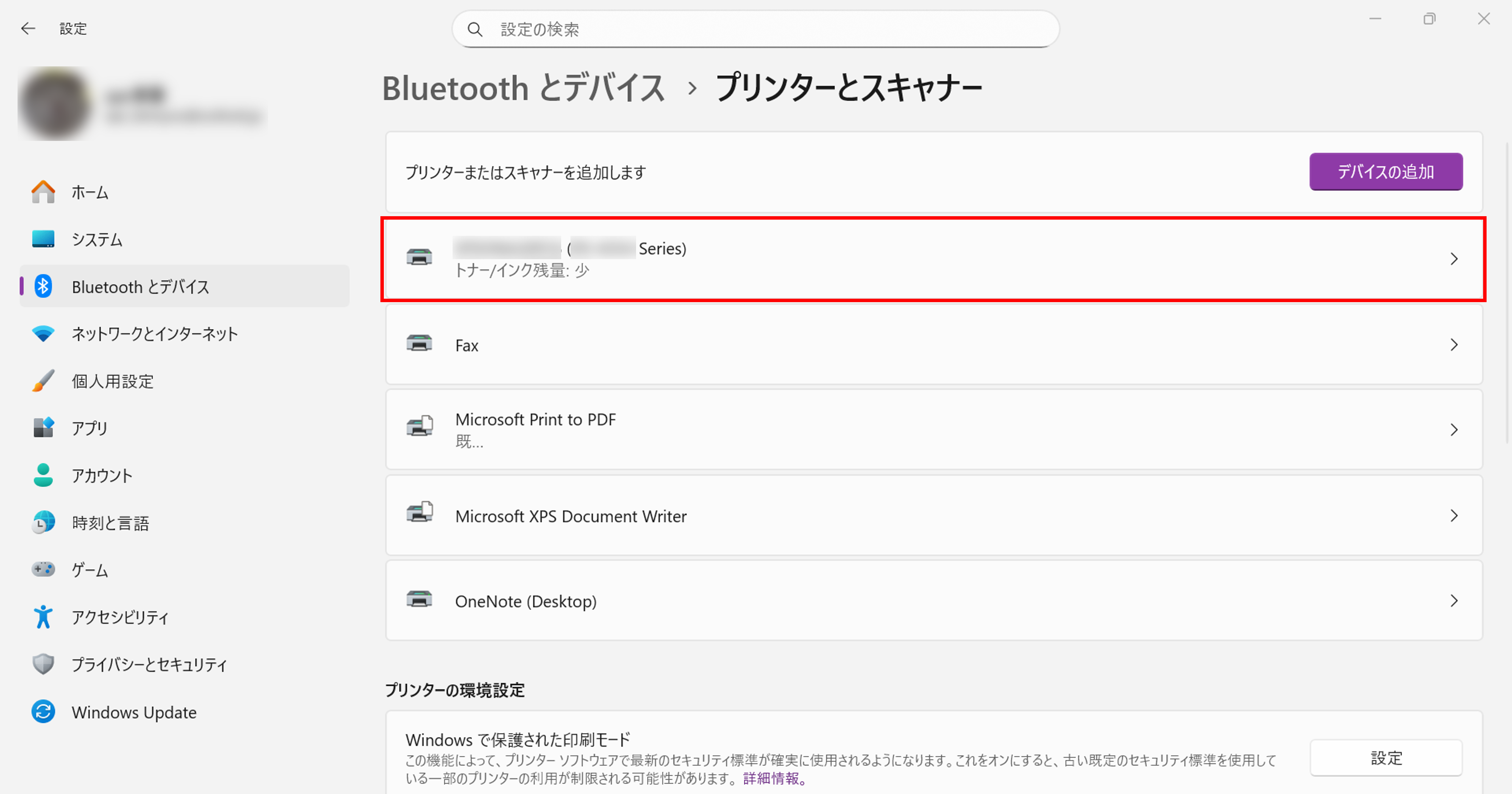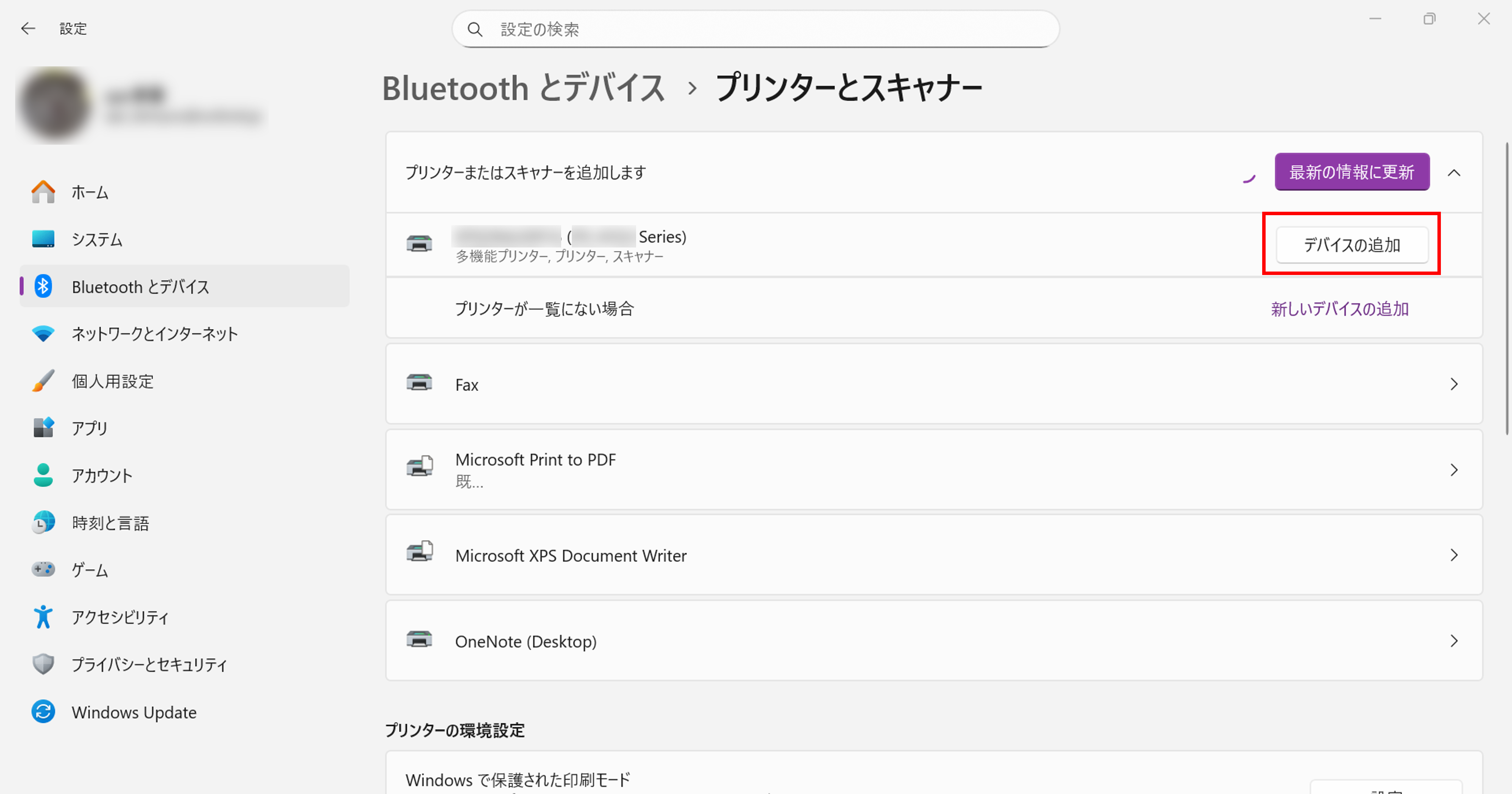 6.検索委結果の一覧から追加したいプリンターを選択し、「デバイスの追加」 をクリックします。